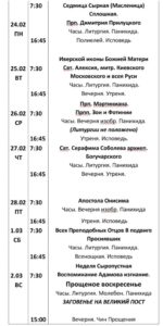 Расписание Богослужений Опубликовано 17.02.2025 sabinina08 Поделиться:TwitterВКонтактеОдноклассникиGoogle